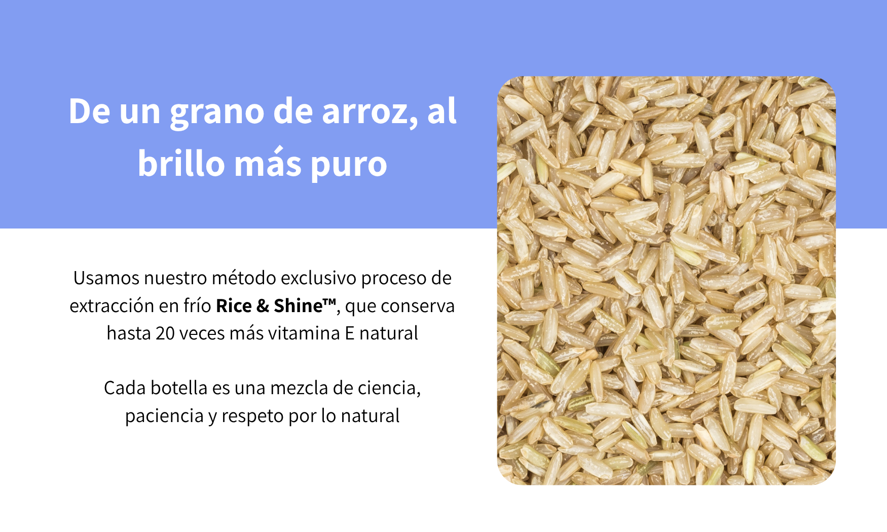 Hecho con GERMEN DE ARROZ Y VITAMINA E PURA, Rice & Shine es más que una marca...